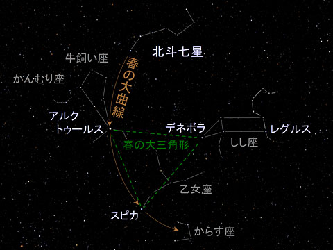 ★やまびこネットさんの「自然観察100」にこんなふうに星座の位置を見つけるやりかたが載ってました