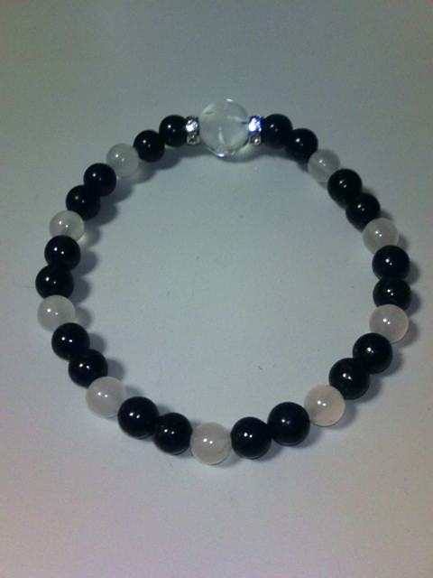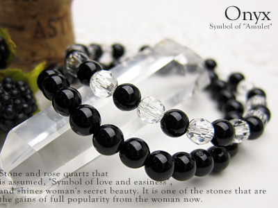 左がオニキスと水晶のブレスレット、そしてアクアマリンと水晶のブレスレットです