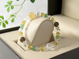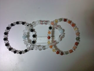 水晶やら丸玉やら、そろばん形の水晶やらいろいろのブレスレットです。